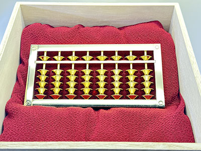 枠はバフ掛けをしているので、本金メッキが一層引き立ちます。桐箱に座布団を敷きそろばんを載せると学業成就・商売繁盛の縁起物として喜ばれるのではないでしょうか。