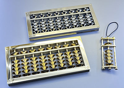 上がクロームメッキを施したものです。右下のグッズは一桁のそろばんで、キーホルダーとして仕上げました。